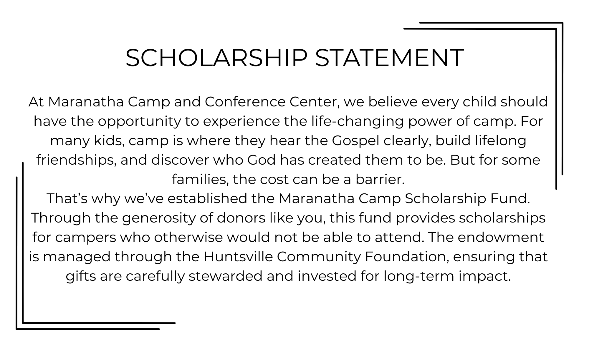 At Maranatha camp and conference center, we believe every child should have the opportunity to experience the life changing power of camp -- regardless of their financial situation. TO make this possible we have established a scholarship program supported by generous donors like you.